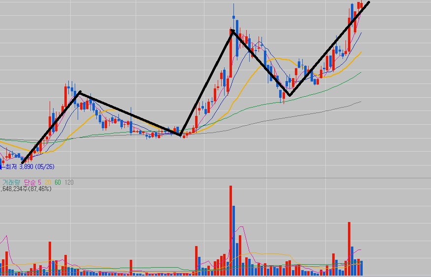 위의 차트는 매집 기간이 꽤 길고 매집봉도 있어요. 그래서 조금 더 상승할 수 있겠단 생각에 상승 캔들 몸통의 중간쯤에서 매수를 했어요. 3,750원 손절 잡고, 4,800원에 매도하려고 했어요. 일주일 정도 예상했는데 바로 오늘 껑충 뛰어 올라서 예상보다 더 많은 수익을 낼 수 있었어요.