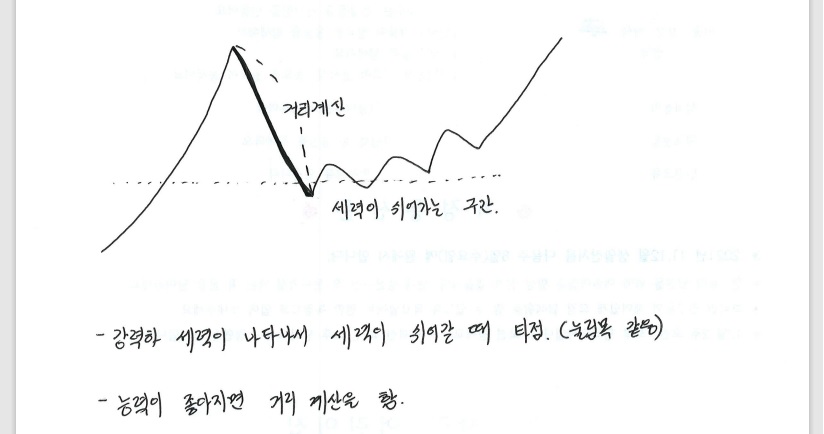 강력한 세력이 나타나서 상승을 하고 세력이 쉬어가는 구간이 있어요. 필자의 생각으로는 이 부분이 눌림목 같아요. 이 부분이 바로 타점이에요. 나중에 실력이 좋아지면 위의 그림에서 표시된 '거리 계산'을 할 수 있대요.