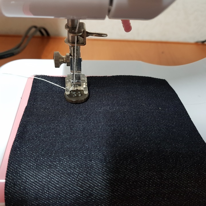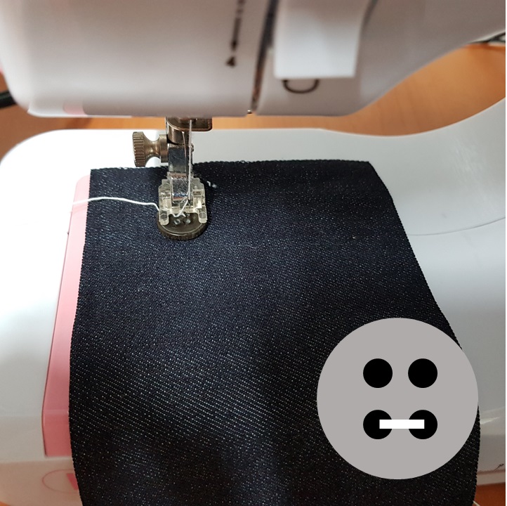 아래 사진과 같이 단추달기 노루발을 장착하고 원단과 함께 단추달기 노루발 밑으로 단추를 넣는다. 청지 원단이라 두꺼워서 잘 안 들어간다..ㅠㅠ 단추가 위치할 자리까지 힘을 주어 밀어 넣었다. 노루발 리프트를 위로 들어준 상태로 단추를 끼우면 노루발이 조금 더 위로 올라가기 때문에 쉽게 들어간다.