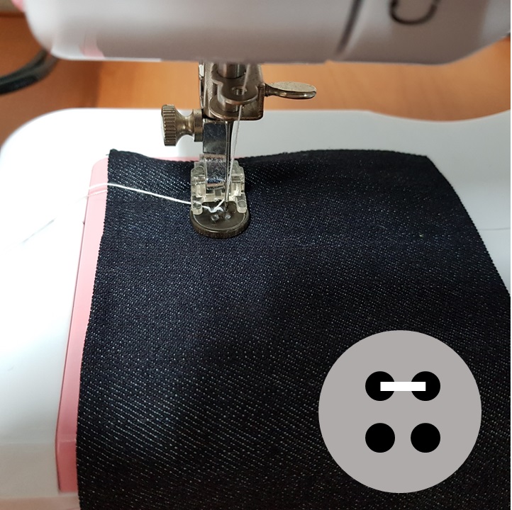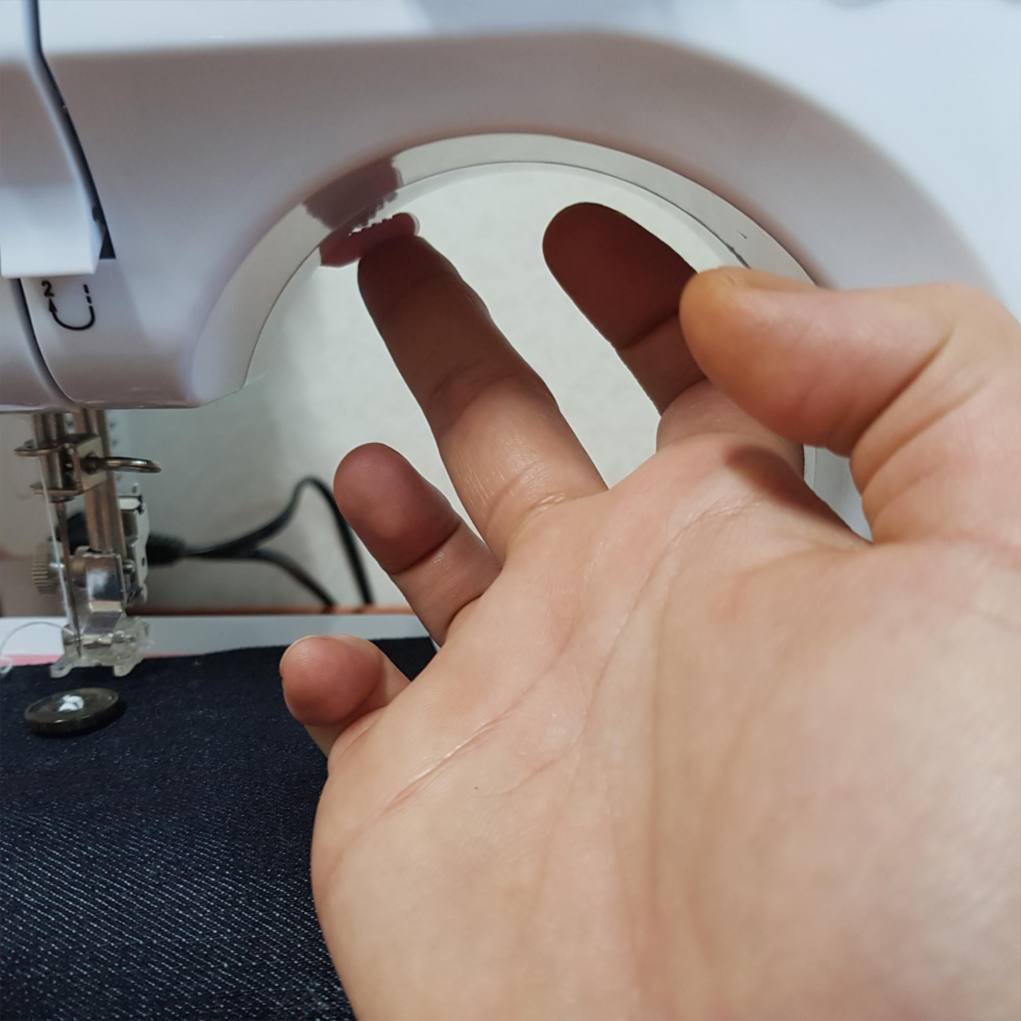 노루발을 들고 원단과 단추를 안으로 밀어 넣고 아래 사진에 표시된 단추의 구멍을 박았다. 잘 안 들어가서 욱여넣었다. 역시 폴리(핸드 힐)를 돌려서 박았다.
