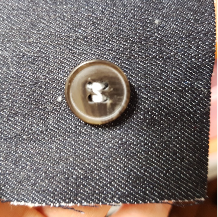 아래 사진은 단추달기를 완성한 사진이다. 원단 돌려가면 4개의 구멍 모두 연결해도 되지만 이 정도만 박아도 풀리진 않을 것 같다.