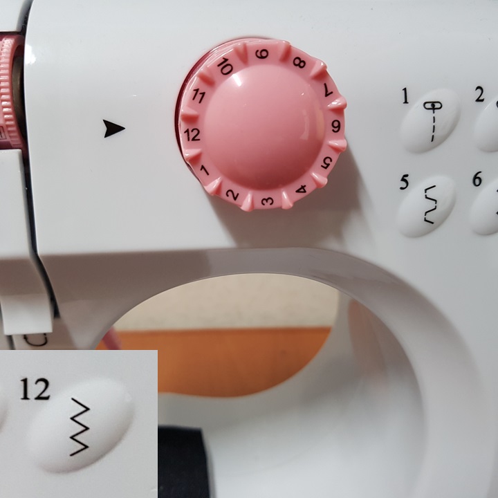 아래 사진과 같이 12번 패턴을 선택하고 폴리(핸드힐)를 돌려서 아래 사진에 표시된 단추의 구멍을 박았다. 페달을 밟거나 속도조절 스위치를 이용해서 박아도 되지만 바늘구멍 안 맞아서 바늘 부러질까 봐 폴리를 손으로 돌리며 4~5번 정도 박았다.