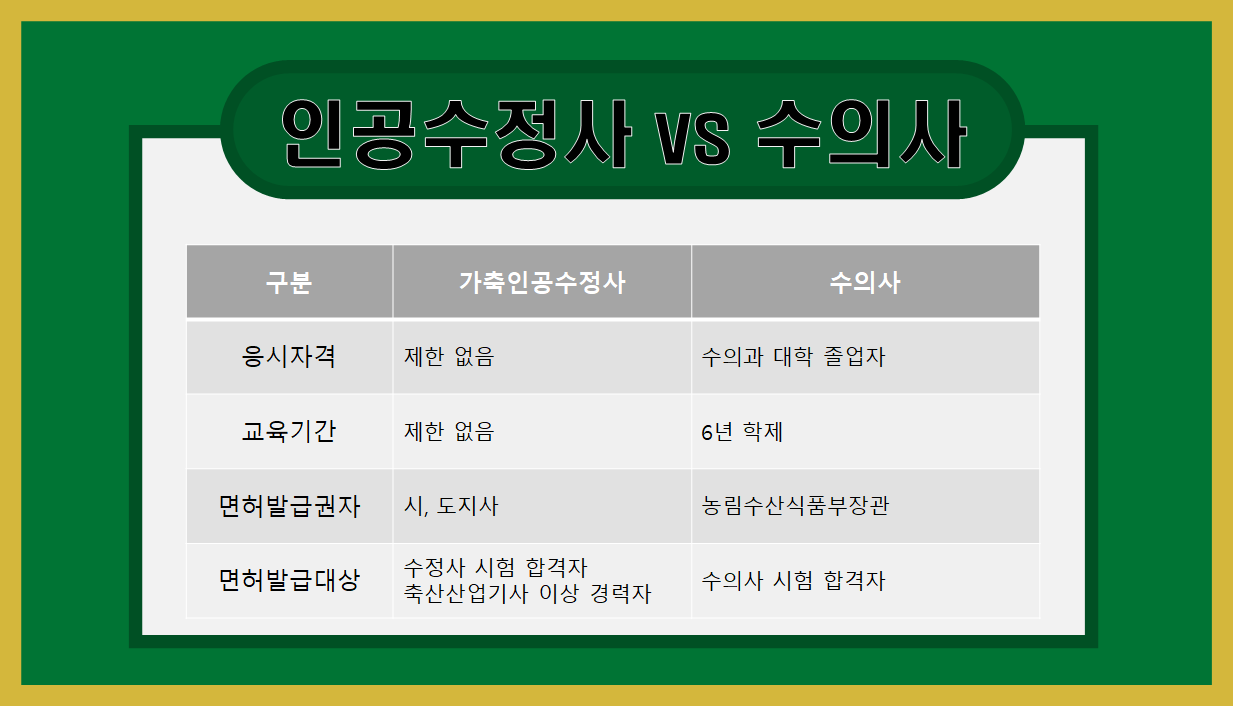 가축 인공수정사와 수의사는 가축의 인공수정을 할 수 있는 공통점이 있어요. 직무의 범위는 아주 크겠지만 대표적으로 가축인공수정사는 호르몬제와 마취제를 주사할 수 없다고 했어요. 이 부분은 수의사의 고유 영역이라고 했어요.