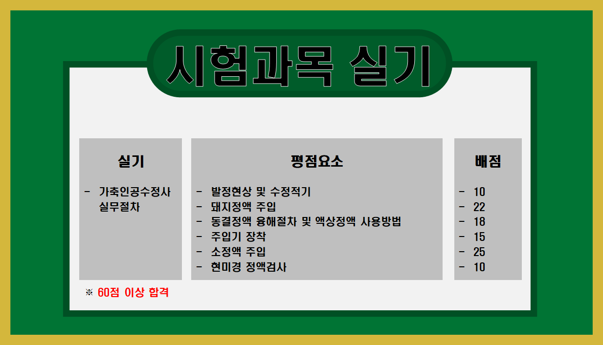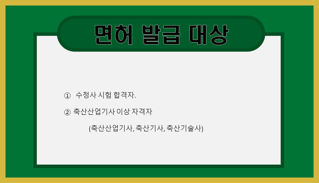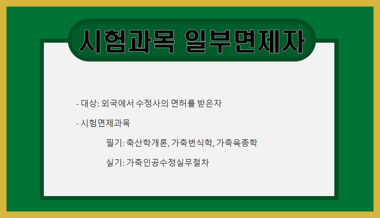 가축 인공수정사 시험을 보지 않아도 자격을 취득 할 수 있는 방법이 있어요. 축산산업기사 이상의 자격을 갖추면 가축 인공수정사 면허를 발급해 준대요. 더 환장할 만한 자격을 갖추라는 거예요. 일단 산업기사의 응시 자격은 전문대 졸업 예정자 또는 졸업자 또는 실무경력 2년 이상 또는 기능사 자격증 취득 후 실무경력 1년 이상인 자만 응시할 수 있어요. 축산기사 응시 자격은 4년제 졸업 예정자 또는 졸업자예요. 일단 필자는 응시 자격이 안 돼요. 그렇다면 필자가 축산산업기사 이상의 자격을 취득하기 위한 방법은 돈 내고 학점 받아야 돼요. 싫어요. 돈 내고 가상 수업 들어가면서 시험도 봐야 돼요.
