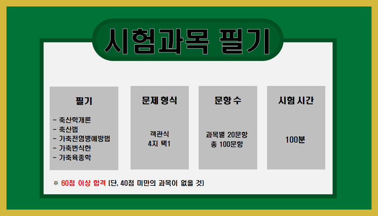 가축 인공수정사 필기 시험은 다른 자격시험과 합격 기준이 다르지 않아요. 과목을 봤더니 흥미로워요. 축산법, 축산학 개론, 전염병 예방법은 한 번 읽으면 이해는 할 것 같긴 한데 번식학과 육종학이 관건일 것 같아요. 아니다. 모든 과목이 다 문제예요. 가축은 소와 돼지만 생각했는데 축산법으로 정한 동물은 소, 말, 면양, 염소, 돼지, 사슴, 닭, 오리, 칠면조, 메추리, 타조, 꿩 그 밖에 대통령령으로 정하는 동물이래요. 쉽지 않겠어요.