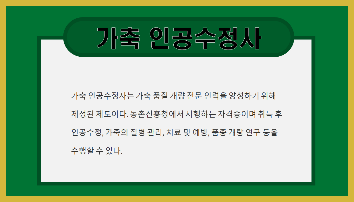 가축인공수정사는 가축 품질 개량을 위해 전문 인력을 양성하기 위한 제도래요. 농촌진흥청에서 시행하는 가축인공수정사 자격증 취득 후 인공수정, 가축의 질병 관리, 치료 및 예방, 품종 개량 연구 등을 수행할 수 있다고 해요.