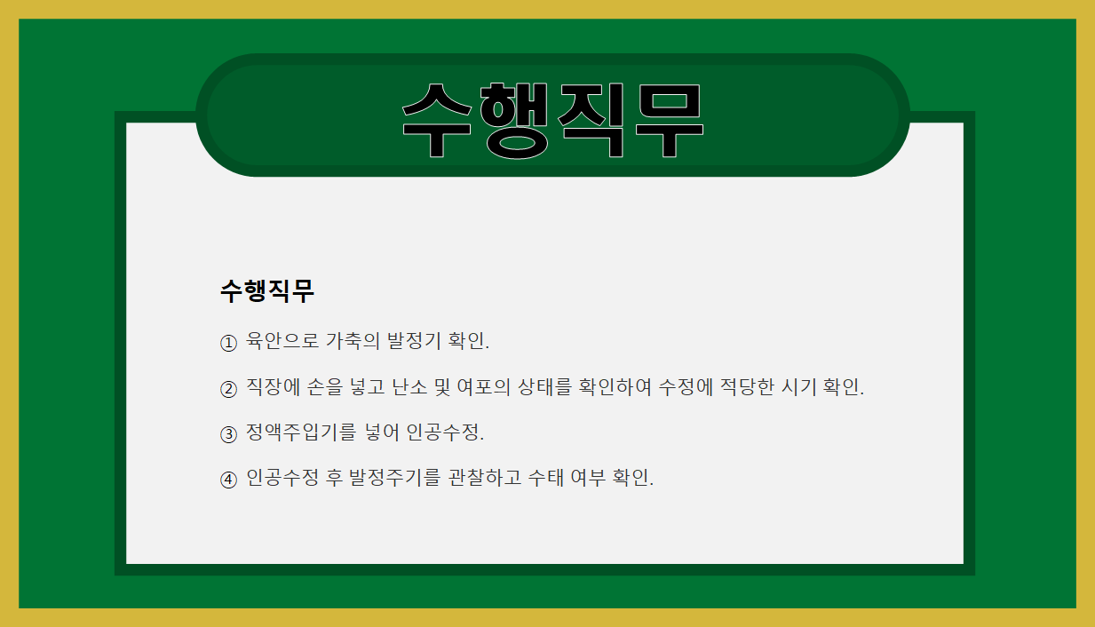 4) 인공수정 후 발정주기를 관찰하고 수태 여부 확인.