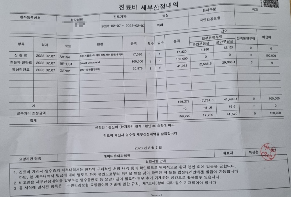 안도하며 병원비를 계산했어요. 계산할때 친절한 간호사 선생님이 필요한 서류 있냐며 물어봐요. 실비 처리할 수 있도록 진료비 계산서와 세부산정내역을 달라고 했더니 바로 출력해서 주셨고 서류 발급 비용은 지불하지 않았요. 초음파는 비급여 항목이고 100% 본인부담이에요. 그래서 총병원비가 117,700원이에요.