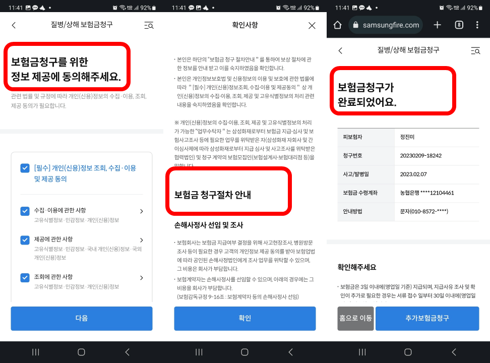 아직 끝나지 않았어요. 정보 제공 동의하고, 보험금 청구절차 안내 확인해야 보험금 청구가 완료 돼요. 이제 신청은 끝났으니깐 지급되기를 기다리면 돼요.