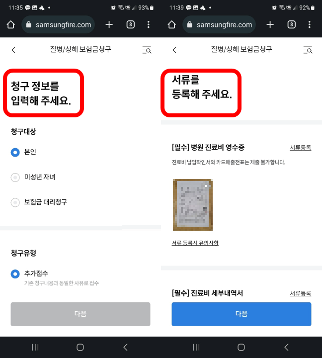 청구 정보를 입력하래요. 그리고 서류를 등록하래요. 서류는 병원 진료비 영수증과 진료비 세부낵역서만 있으면 돼요. 처방전이 있다면 처방전과 영수증을 첨부하면 돼요.