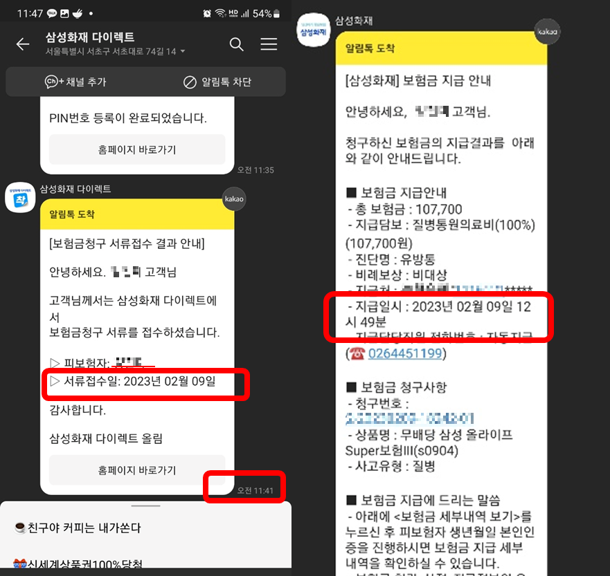 바로 보험금청구 서류가 접수 되었다는 카톡 알림이 와요. 그리고 얼마 지나지 않아 삼성화재에서 또 카톡 알림이 와요. 뭐지? 확인해 봤더니 바로 지급됐어요. 묻지도 따지지도 않고 지급해 주는 삼성화재 다이렉트 보험이에요. 접수는 2월 9일 11시 41분에 했고 지급은 2월 9일 12시 49분에 됐어요. 실손 의료비 1시간만에 지급받았어요. 이런 빠른 일처리 어떻게 가능하죠? 와~ 진짜 놀라워요. 원래 통원 의료비 청구하면 이렇게 빨리 지급되나요? 필자는 처음이라 매우 놀라웠어요.