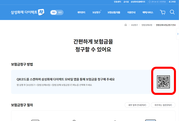 필자는 삼성화재 실손 보험이 있어요. 표준형 이전에 가입해서 흔히 실손 1세대라고 말해요. 가입기간이 15년이 넘었는데 처음으로 실손 보상청구를 했어요. 삼성화재 다이렉트 홈페이지에 들어갔더니 보상청구 접수 방법이 3가지가 있어요. 우편, 이메일, 모바일. 모바일이 제일 편해요. 전송해야 할 문서가 많지 않아서 QR코드 찍어서 모바일로 접수를 했어요.