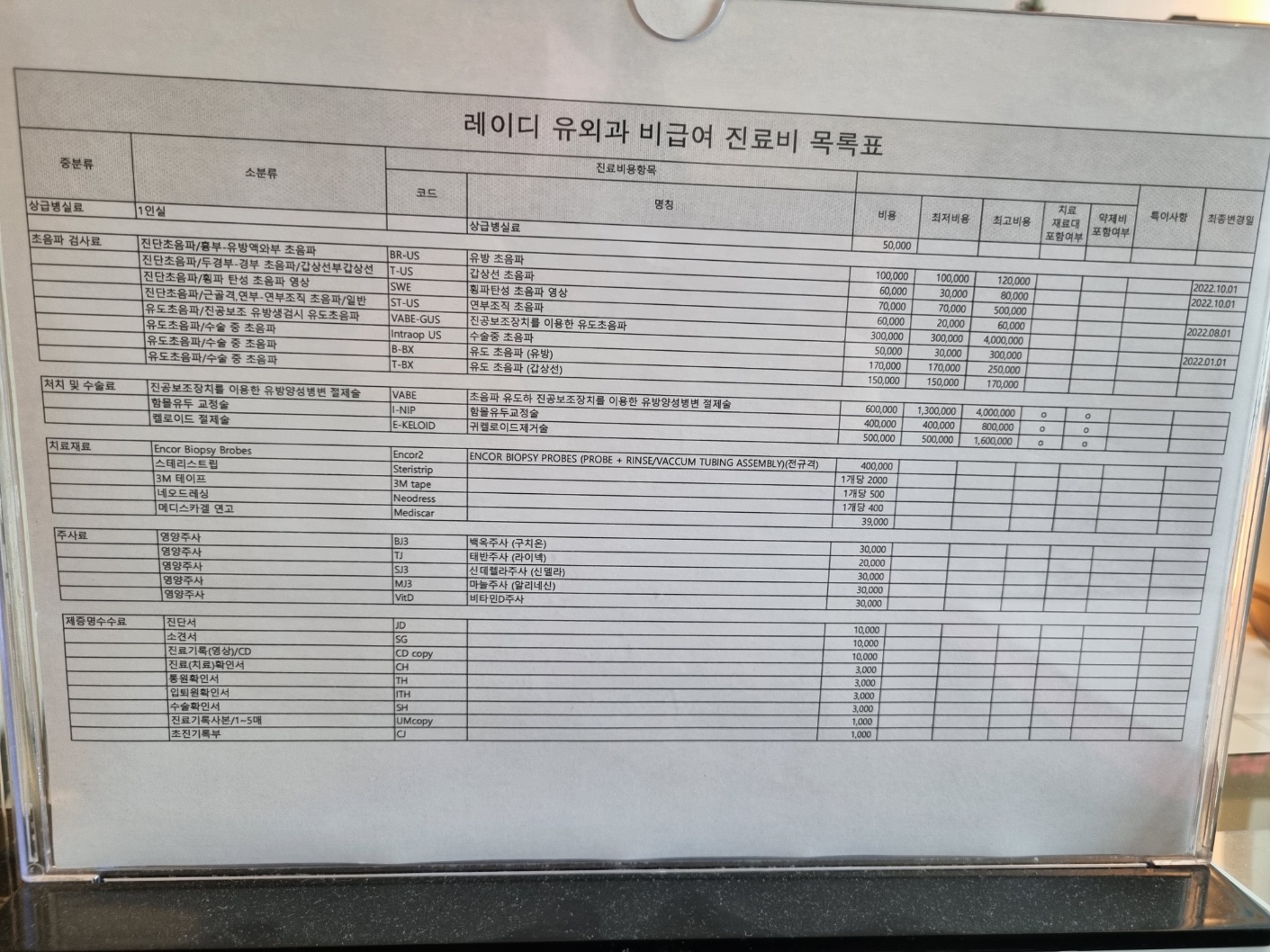 대기할 때 비급여 진료비 목록표를 사진으로 찍었어요. 혹시나 다음에 또 갈 일이 생기면 진료비를 참고할 수 있을 것 같아서요.