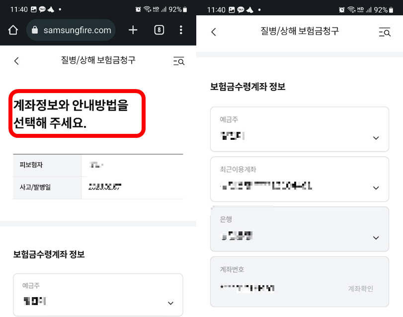 보험금을 수령할 계좌정보와 안내방법을 선택해요. 안내 방법은 복수 선택이 가능하고 문자, 이메일, 우편, 팩스, 전화, 연락받지 않기 선택할 수 있어요. 필자는 문자를 선택했던 거 같아요.