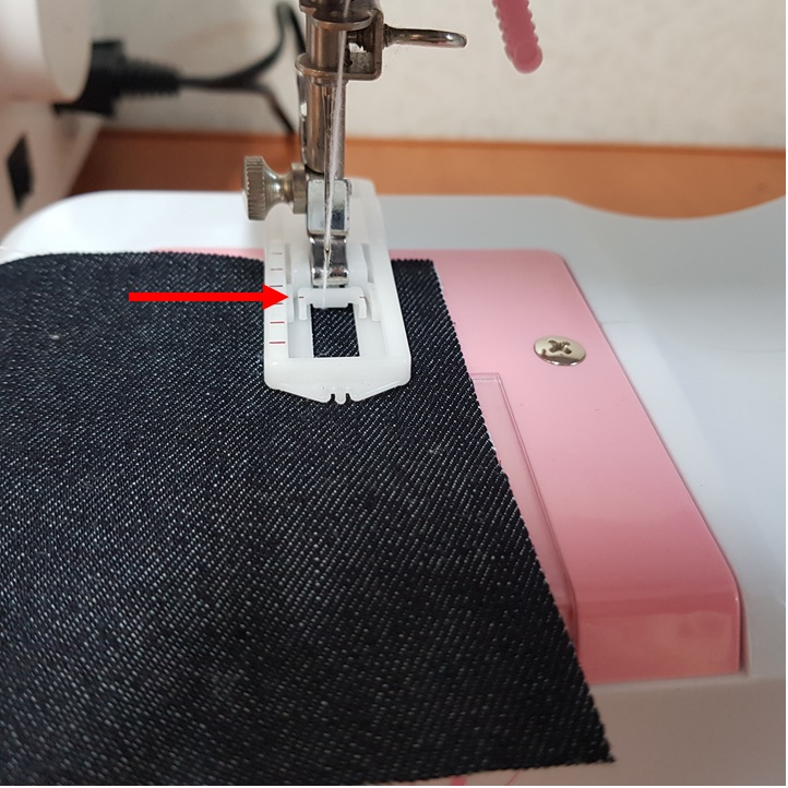 이제 노가다 시작이다. 아래 사진과 같이 혼스 미싱에 단추구멍 노루발을 장착한다. 그리고 원단을 끼우고 단추구멍 노루발에 있는 슬라이더를 제일 뒤쪽에 위치시킨다. 테이프를 붙인 부분까지. 그리고 노루발 리프트를 내린다.
