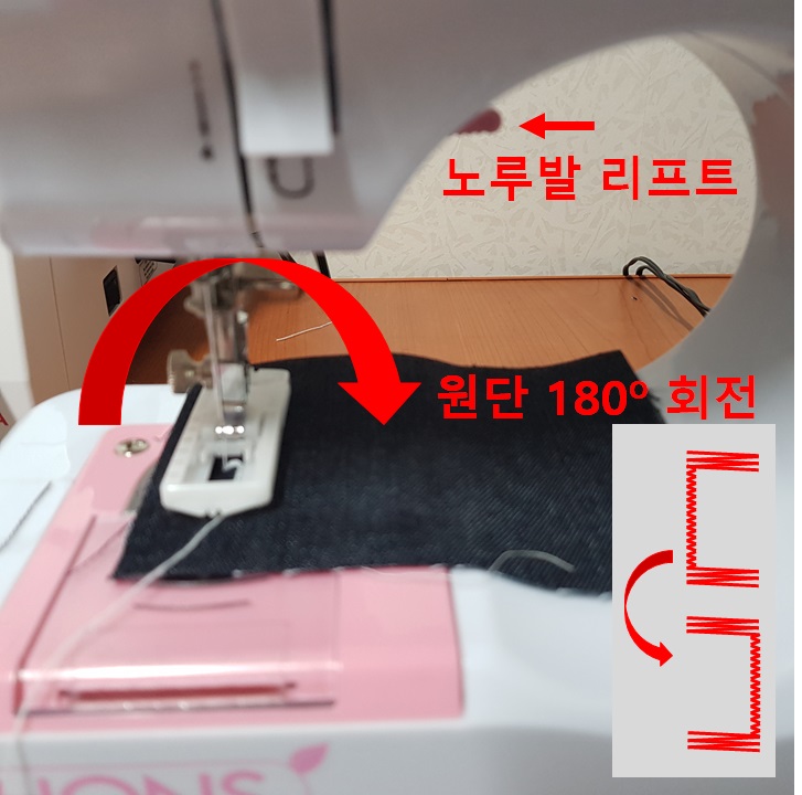 노루발 리프트를 이용하여 단추구멍 노루발을 올리고 원단을 180º 회전한다.