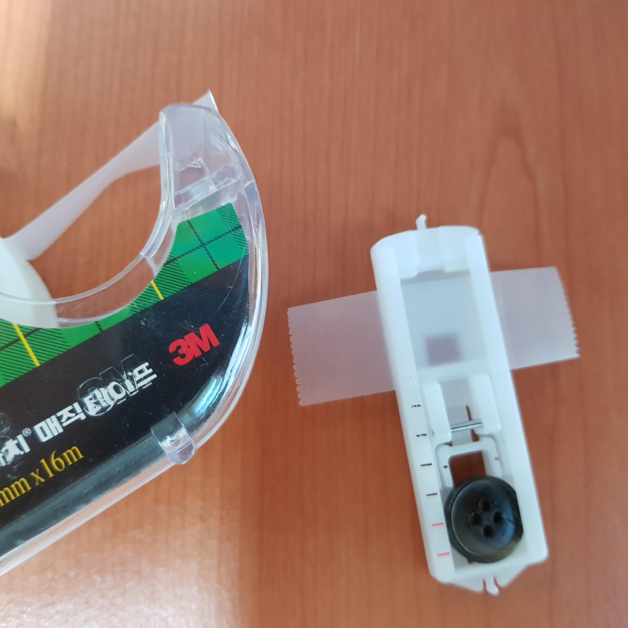 일단 단추구멍 노루발을 장착하기 전에 선행되어야 할 일이 있다. 아래 사진과 같이 단추를 단추구멍 노루발 앞에 끼워주고 단추의 크기를 잰다. 그리고 상하로 움직이는 슬라이더가 뒤쪽으로 이동할 수 없도록 테이프를 붙여서 고정한다. 테이프를 붙이는 방법은 정석이 아니다. 그러나 단추구멍 만들다 슬라이더가 뒤로 밀리는 순간 단추 구멍의 사이즈가 변하게 된다. 아무튼 혼스 미싱으로 단추구멍 만들려면 노가다성이 강해서 저 슬라이더가 뒤로 밀리지 못하도록 해야 한다.