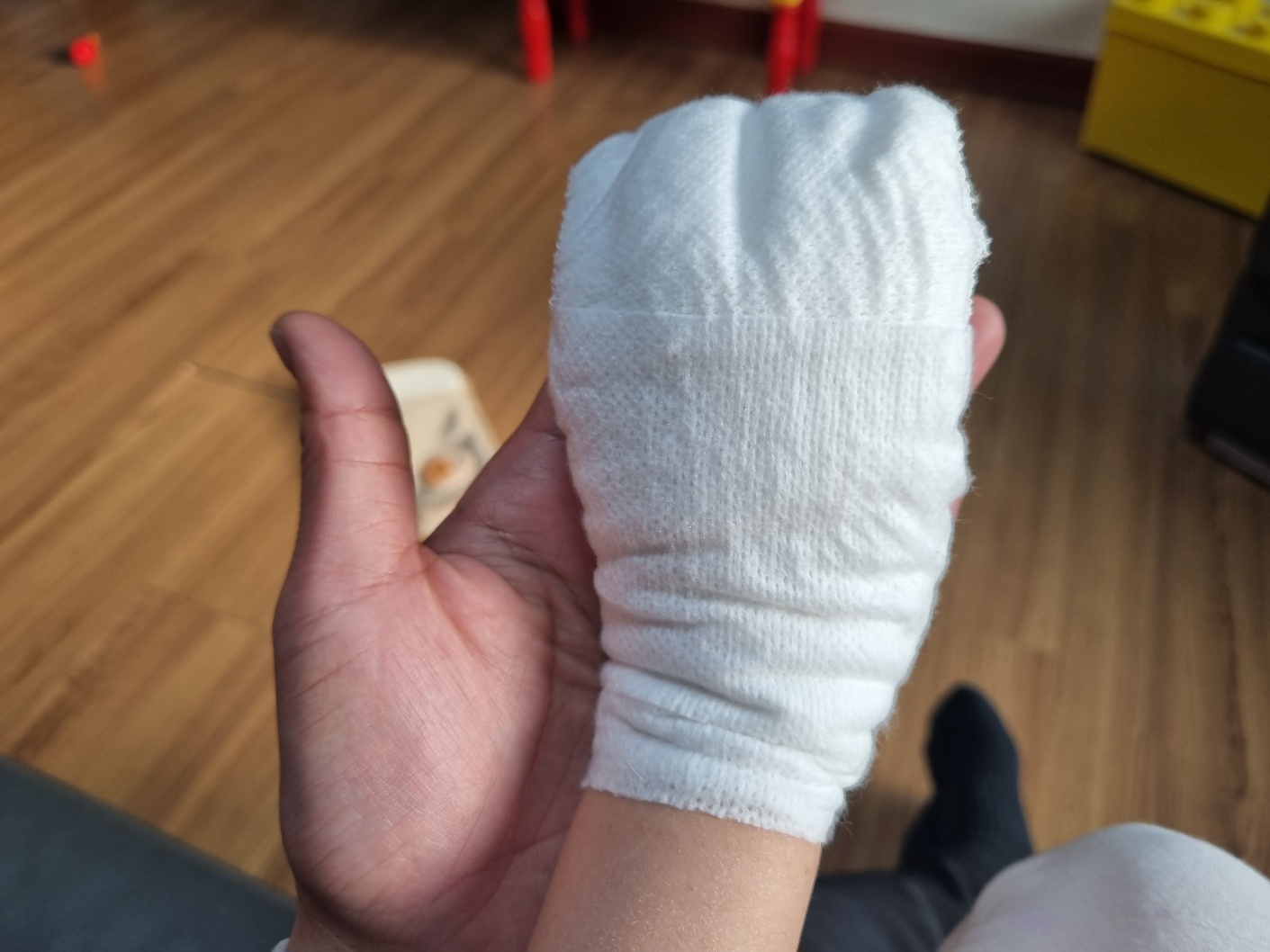 필자는 의료진의 말을 잘 들어요. 금요일 저녁 소독하고, 병원에서 챙겨준 연고 바르고 폼으로 덮고 붕대를 감았어요. 혹시나 아플까, 상처가 더 깊어지진 않을까 조심스레 살살 만졌어요. 소독할 때도 문지르면 안 된다고 톡톡 두드리라고 해서 소독도 아주 살살 톡톡 두드리기만 했어요. 그리고 마른 거즈로 손에 남아있는 생리식염수를 톡톡 닦았어요. 무서워요. 간호사 선생님이 해줄 땐 엄청 빠르고 쉽게 하는 거 같았는데 필자가 하려니 시간도 오래 걸리고 매우 어려워요. 서툰 필자를 보면서 아이가 한마디 해요.