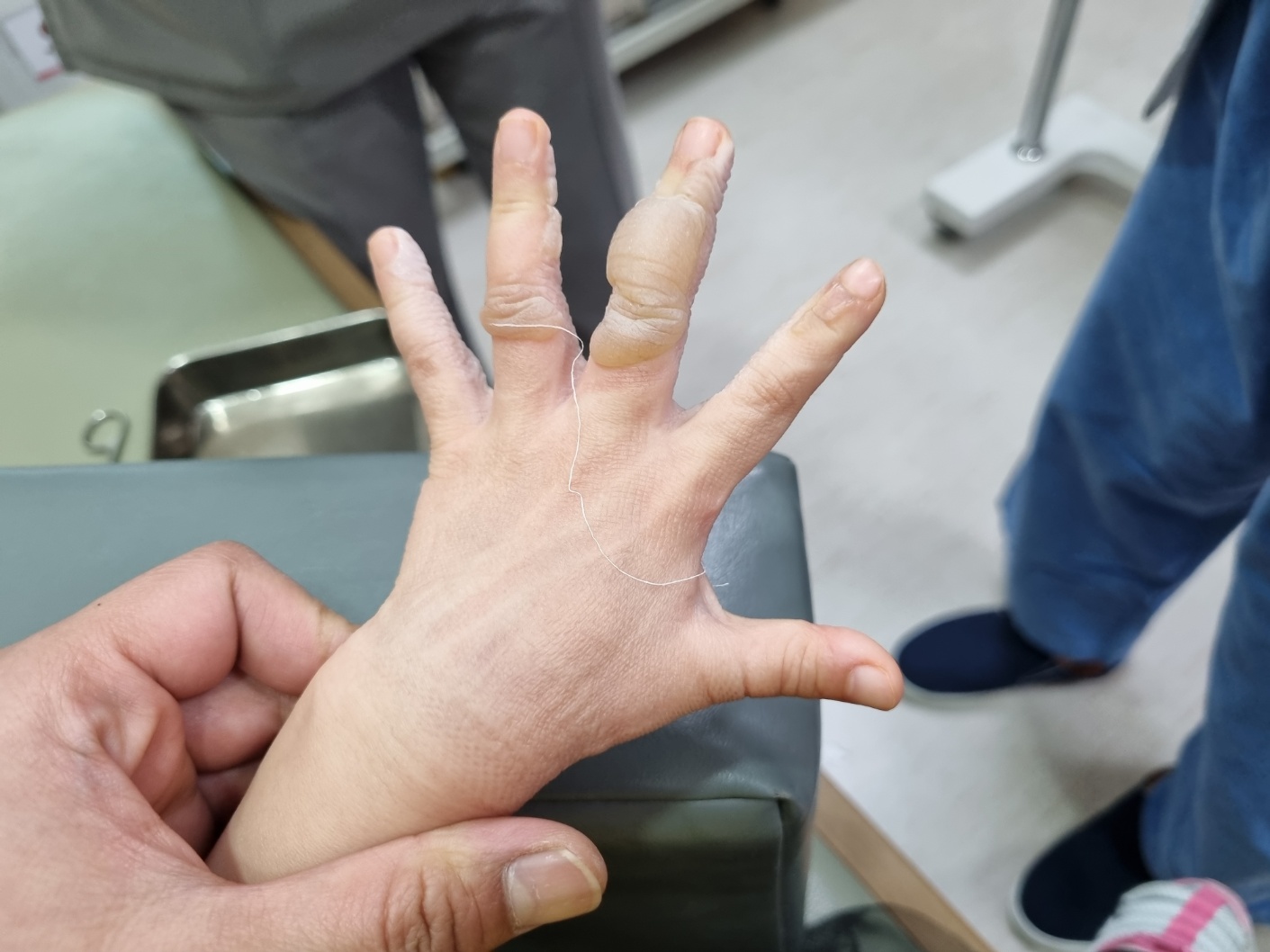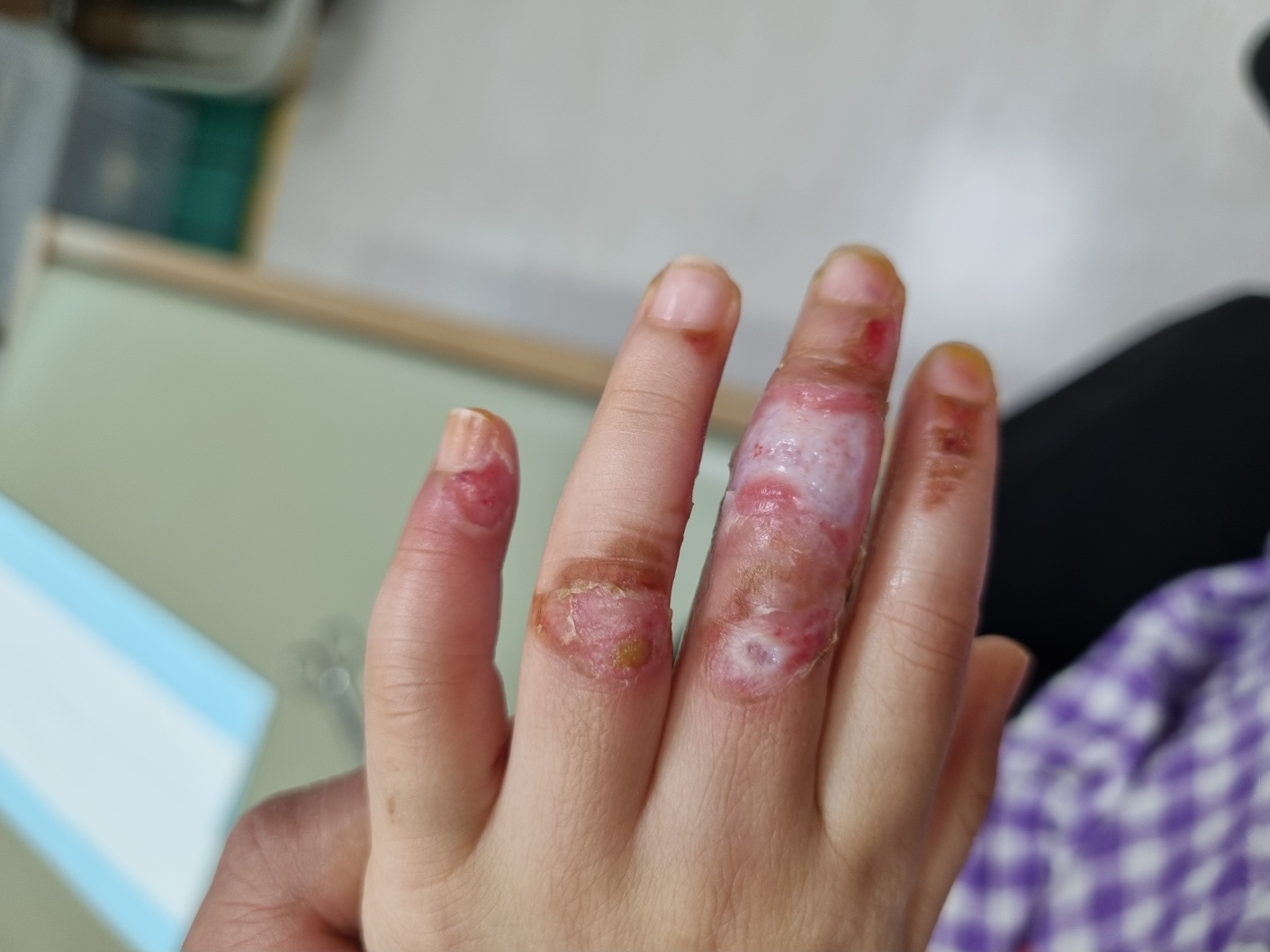 "달고나가 많이 뜨거워요. 달고나 하다 많이 와요. 심재성 2도 화상이 확실하고 심재성과 3도는 한 끗 차이예요. 분홍색, 붉은색은 상처가 깊지 않은 부분이고 흰색, 회색에 가까울수록 깊음 화상이에요. 살이 차오르면서 주변의 멀쩡한 살들이 화상 입은 부위로 밀어요. 화상 입은 부위가 부풀어 올라올 거예요. 그러면 손가락이 손등 쪽으로 꺾이고 손가락을 구부릴 때 피부가 땅겨지는 느낌이 생길 수 있어요. 그렇게 되면 수술을... 이식을...."