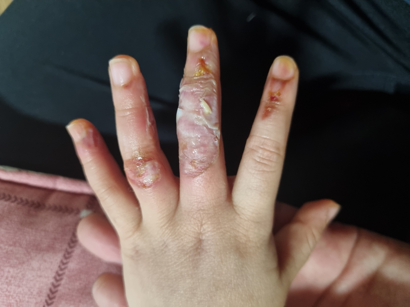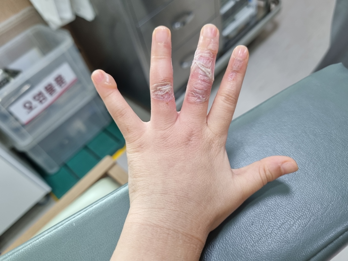 "달고나가 많이 뜨거워요. 달고나 하다 많이 와요. 심재성 2도 화상이 확실하고 심재성과 3도는 한 끗 차이예요. 분홍색, 붉은색은 상처가 깊지 않은 부분이고 흰색, 회색에 가까울수록 깊음 화상이에요. 살이 차오르면서 주변의 멀쩡한 살들이 화상 입은 부위로 밀어요. 화상 입은 부위가 부풀어 올라올 거예요. 그러면 손가락이 손등 쪽으로 꺾이고 손가락을 구부릴 때 피부가 땅겨지는 느낌이 생길 수 있어요. 그렇게 되면 수술을... 이식을...."