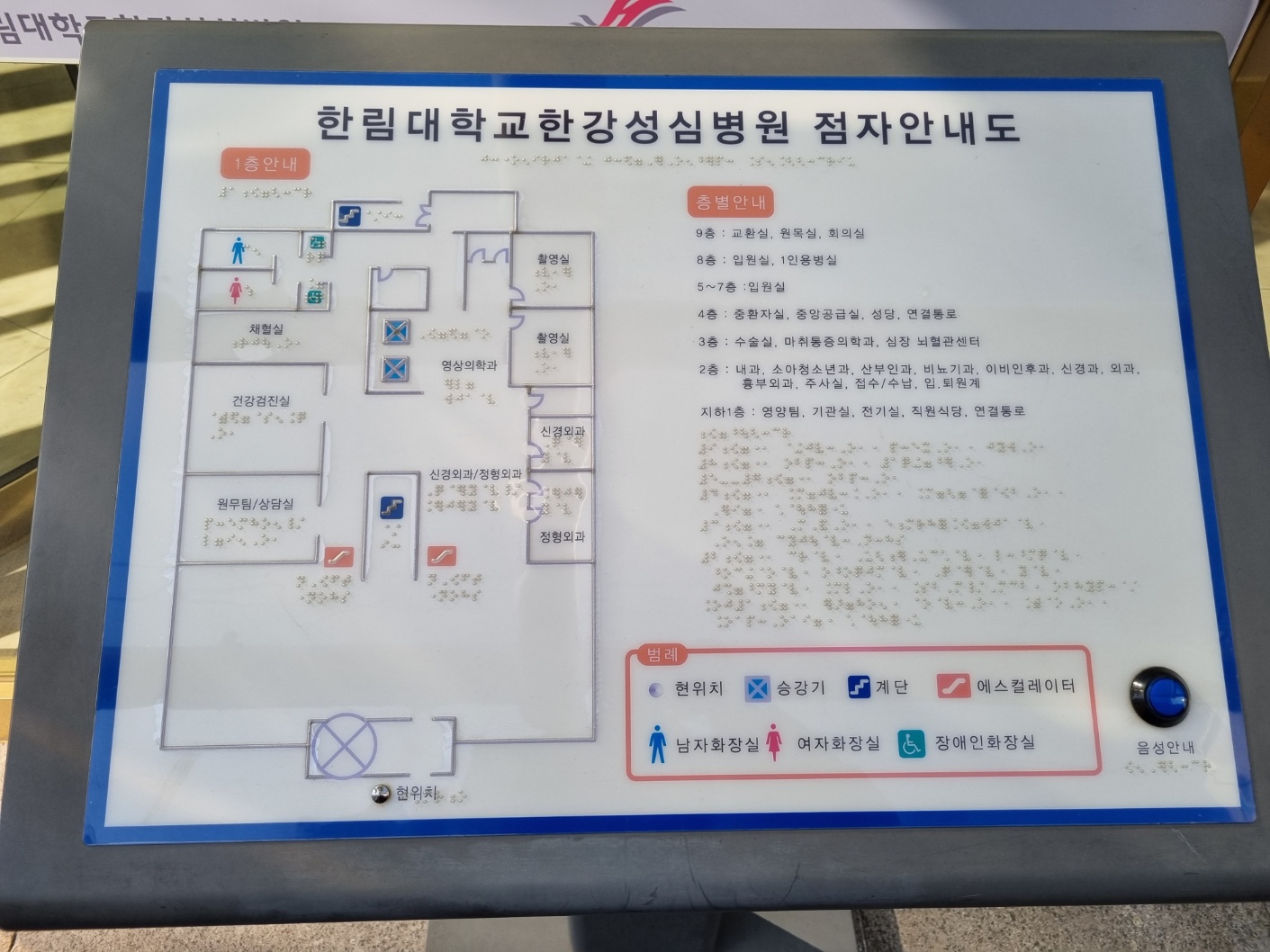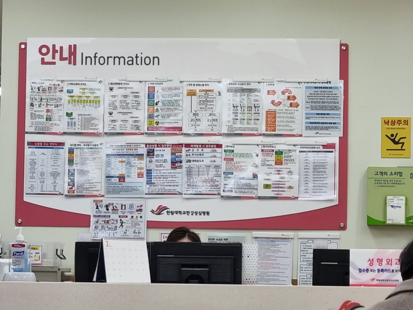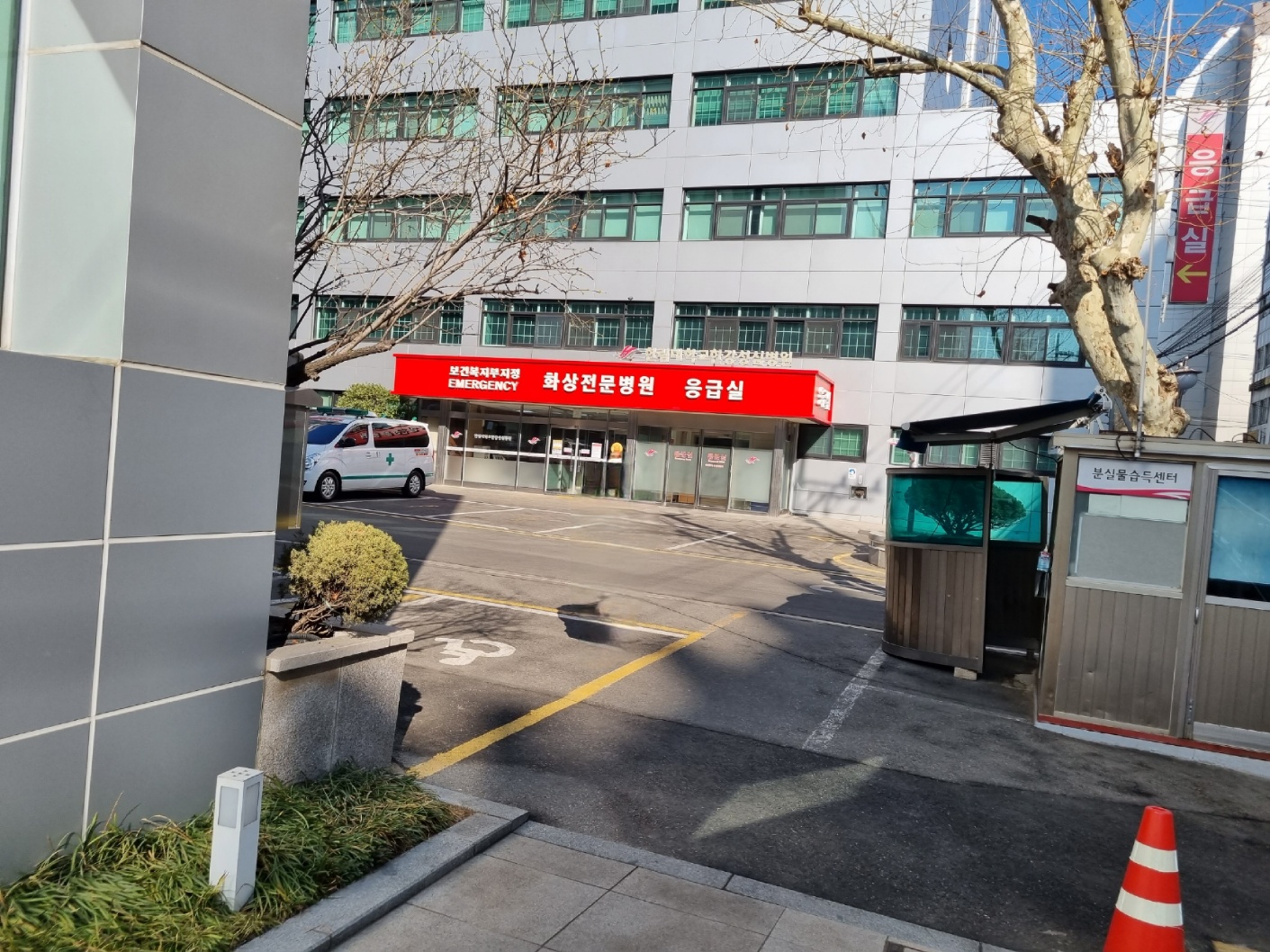 사건 발생 하루가 지나고 한림대학교 화상전문병원으로 갔어요. 외래는 큰길에 있는 건물 입구로 들어가는 것이 아니라 건물 옆 응급실 방향 골목으로 들어가서 응급실을 지나치면 회전문이 보여요. 회전문으로 들어가요. 1층은 로비예요. 두리번거렸더니 안내 직원이 2층으로 올라가래요.