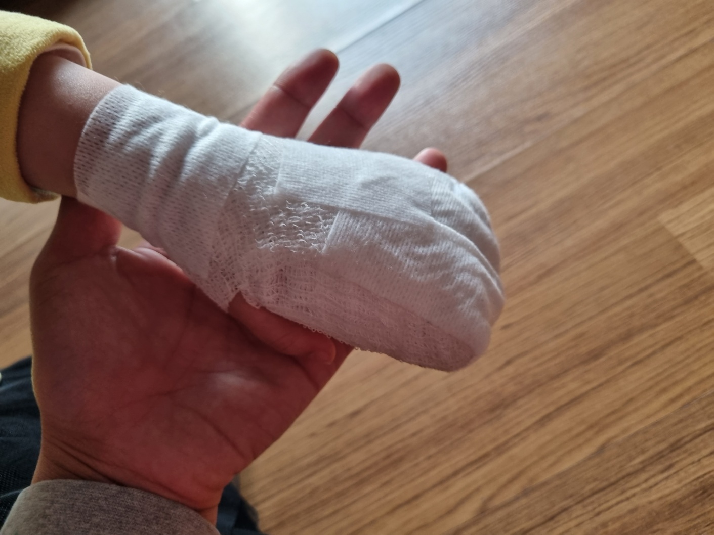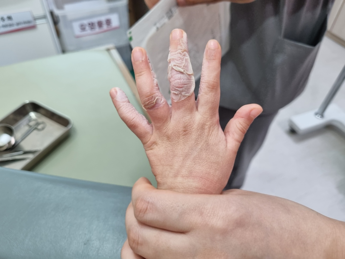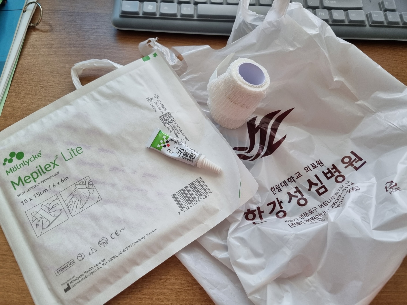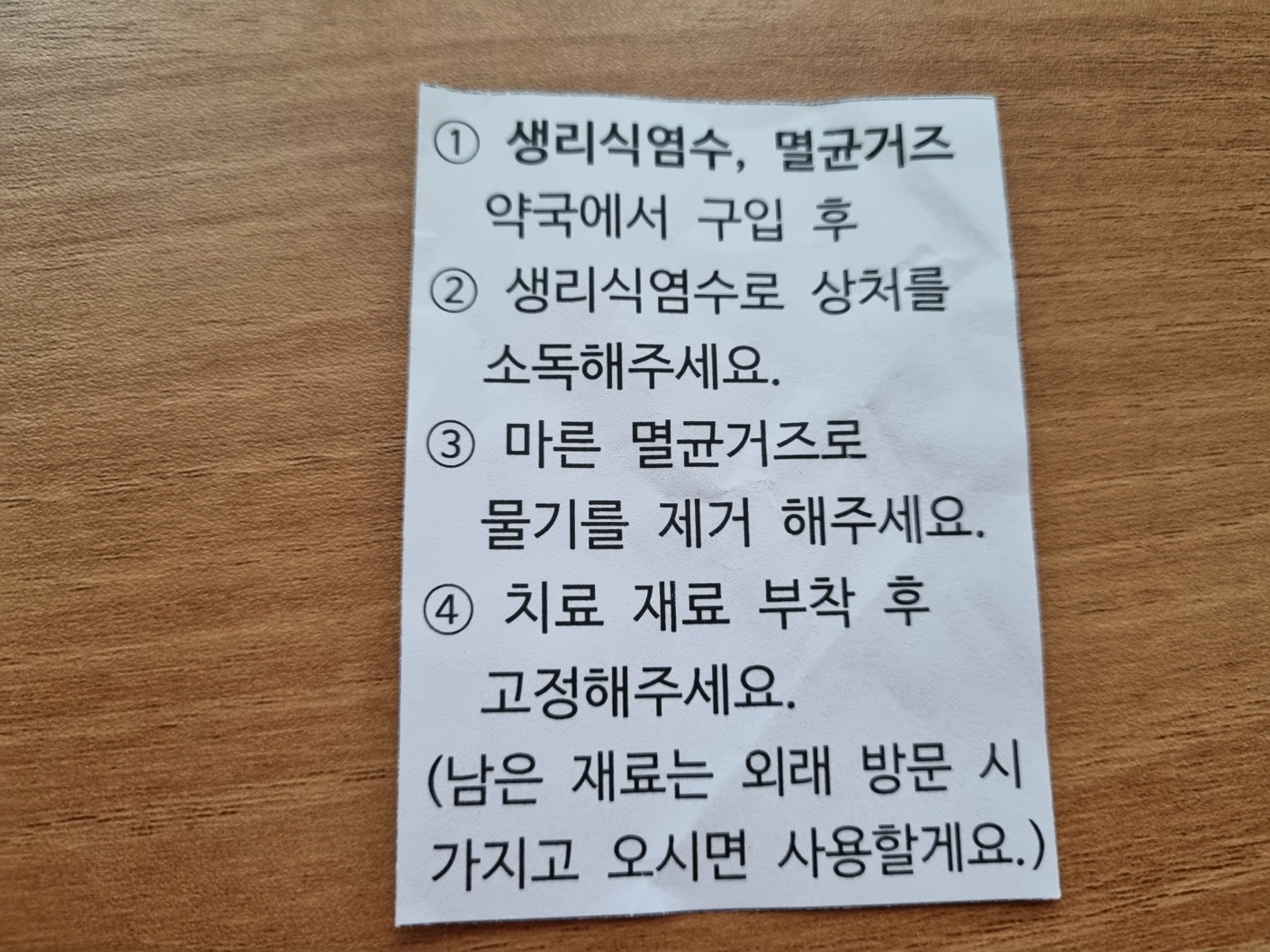이틀에 한번 집에서 소독하고 다음 주 월요일에 다시 오래요. 금요일에 소독하고 월요일 병원에 와서 소독하면 될 것 같다고 하셨어요. 압박하지 말고, 손가락 모으지 말고, 물은 절대 닿으면 안 되고, 혹시 물이 들어가면 바로 소독하고 연고 바르래요. 안내문을 주시면서 약국에서 거즈랑 생리식염수는 구매하면 된다고 했어요. 붕대와 반찬고, 연고는 챙겨주셨어요. 이제 병원에 가는 간격도 점차 줄어들고, 집에서 소독하라고 하니 깊은 화상이 아닌 거 같았어요. 하지만 필자의 대단한 착각이었어요.