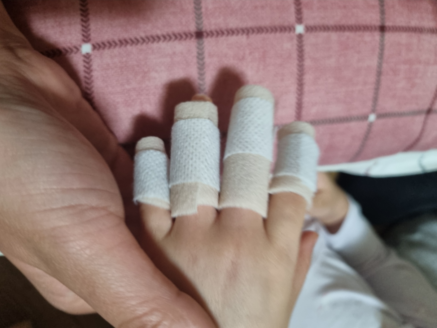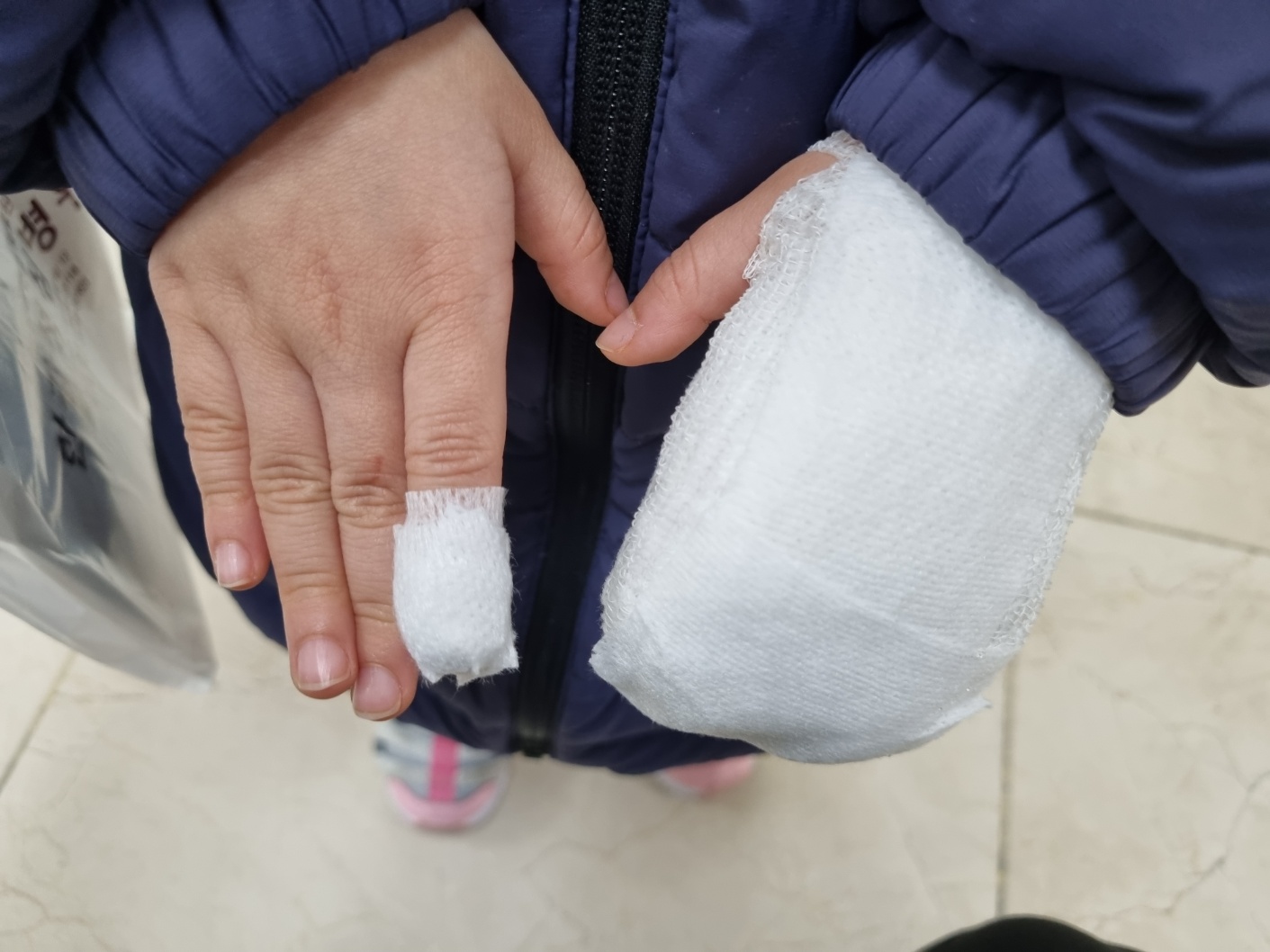 필자는 의료진의 말을 잘 들어요. 금요일 저녁 소독하고, 병원에서 챙겨준 연고 바르고 폼으로 덮고 붕대를 감았어요. 혹시나 아플까, 상처가 더 깊어지진 않을까 조심스레 살살 만졌어요. 소독할 때도 문지르면 안 된다고 톡톡 두드리라고 해서 소독도 아주 살살 톡톡 두드리기만 했어요. 그리고 마른 거즈로 손에 남아있는 생리식염수를 톡톡 닦았어요. 무서워요. 간호사 선생님이 해줄 땐 엄청 빠르고 쉽게 하는 거 같았는데 필자가 하려니 시간도 오래 걸리고 매우 어려워요. 서툰 필자를 보면서 아이가 한마디 해요.