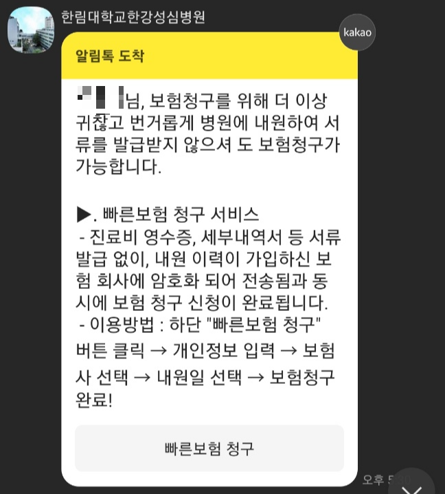 한림대학교 한강성심병원은 빠른 보험 청구가 가능해요. 번거롭게 서류를 발급받고 챙기지 않아도 보험금 청구가 가능해요. 카톡 알림에서 빠른 보험 청고를 눌러요.