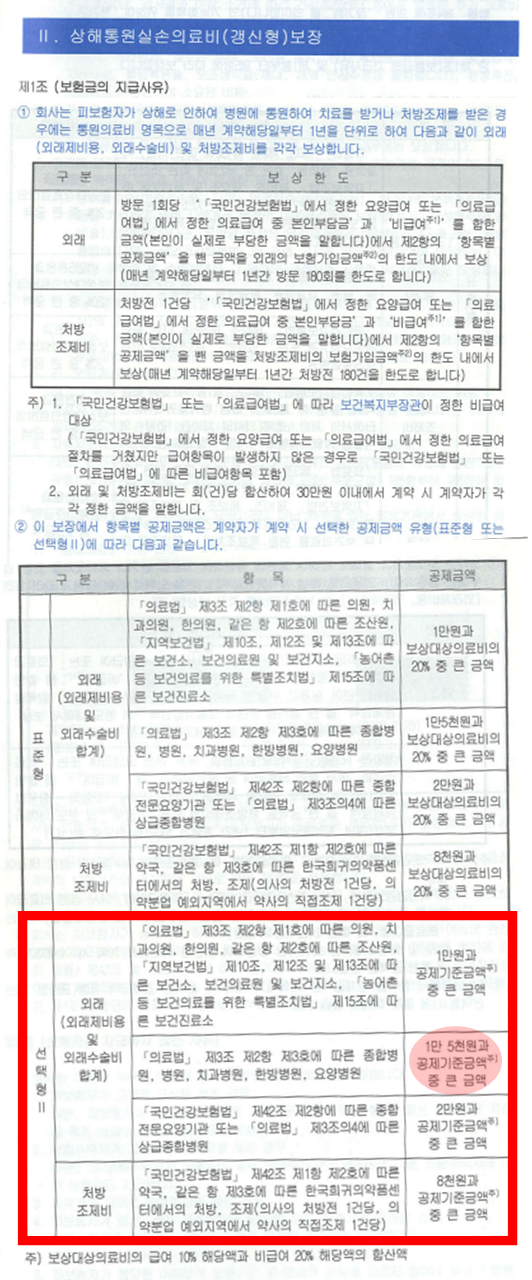 약관을 스캔해서 첨부했어요. 약관도 보고 증권도 봐야 해요. 필자의 아이는 실손의료비 선택형 Ⅱ에 가입되어 있어요. 표준형과 선택형의 차이는 공제 금액이 달라요. 표준형은 공제금액과 보상대상 의료비의 20% 중 큰 금액을 공제해요. 선택형 Ⅱ는 공제금액과 공제기준금액(급여 10%+비급여 20%) 중 큰 금액을 공제해요. 이게 말로 설명하면 어려워요. 영수증을 보고 계산하면 이해가 더 쉬워요.