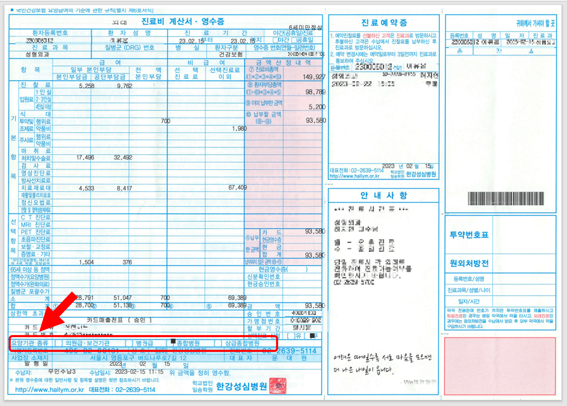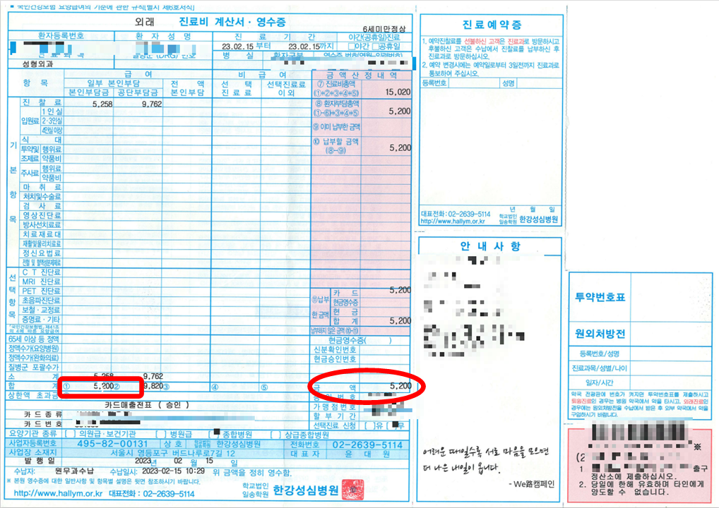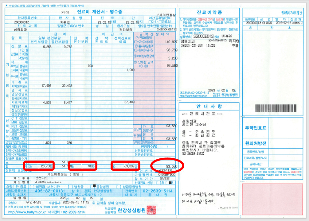2월 15일 2건의 진료비 영수증이 있어요. 5,200원, 93,580원. 필자가 낸 돈은 본인 부담금 총액 98,780원이에요.