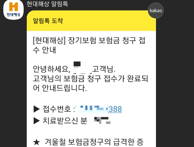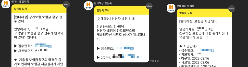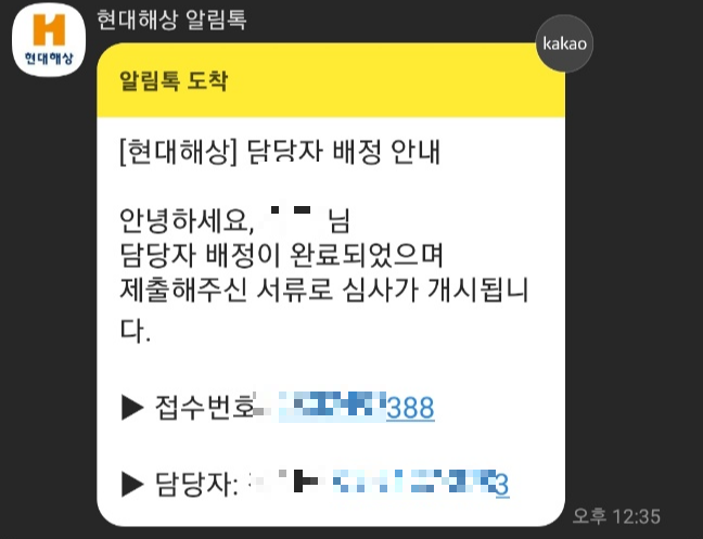 보험금 청구가 끝나면 현대해상 알림톡이 와요. 그리고 하루가 지나고 담당자가 배정되었다는 알림톡이 또 왔어요. 지급은 1~2일 소요된다고 했어요. 아직 지급받진 못했지만 곧 지급되겠죠.