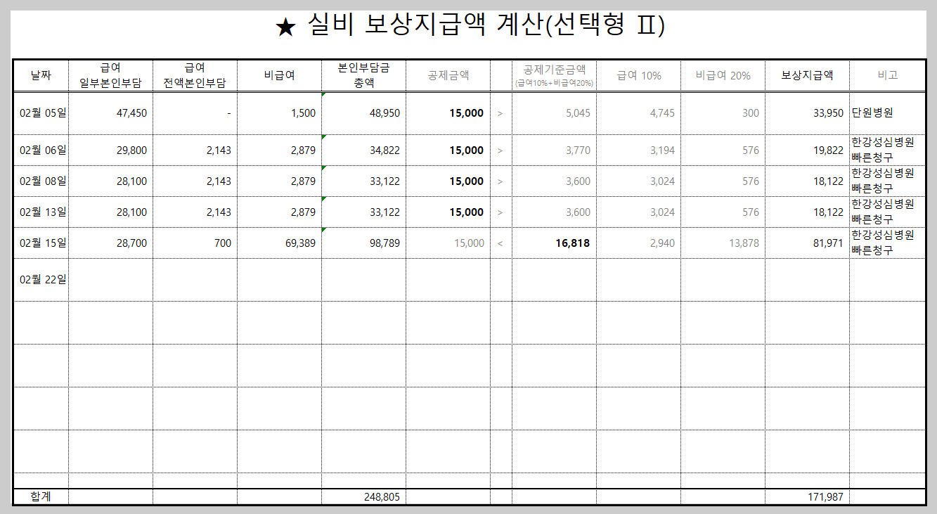 필자는 위의 그림과 같이 액셀 시트를 만들어서 실비 보상지급액 계산을 해요. 왜냐하면 보험사에서 자꾸 눈탱이를 쳐요. 큰 아이 때는 영수증을 모아서 1~2년에 한 번 일괄처리 했어요. 그런데 생각보다 보상지급액이 너무 적었어요. 문의 전화를 했더니 제증명료를 이유로 비용이 발생했대요. 뭐가 뭔지도 모르겠고, 서류는 우편으로 모두 보내서 관련 자료도 남아있지 않았어요. 그냥 알았다고 하고 끝냈어요. 이제 더 이상 눈퉁이 맞고 싶지 않아요. 보상금 청구는 즉시 청구, 보상지급액은 먼저 계산해 보는걸 추천해요. (보상지급액 계산 액셀 시트는 아래 첨부했어요)