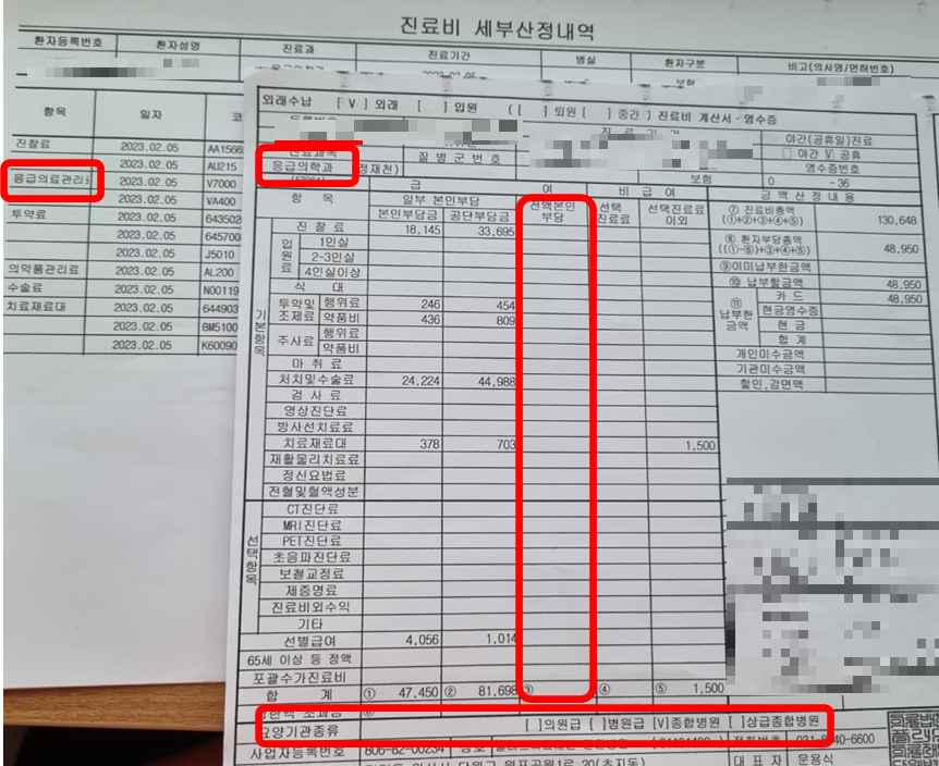 필자는 아이가 둘이나 있어요. 그렇다보니 1~2년에 한 번 정도 응급실에 가요. 그런데 큰 아이는 응급의료관리료가 전액 본인 부담이라 실비 적용이 되지 않았어요. 그런데 둘째 아이는 응급실에 갔는데 전액본인부담 금액이 없어요. 진료비 영수증에 전액 본인부담금이 없으면 보험 청구가 가능해요. 상급종합병원에서 비응급으로 분류되면 실비 청구 불가능해요.