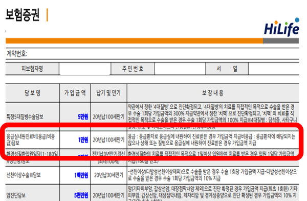 필자의 증권을 확인해 봤더니 응급실 내원 진료비(응급/비응급)담보가 있어요. 가입금액은 1만 원이에요.
