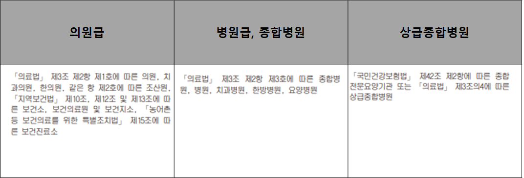 필자가 가입한 실비 보험은 크게 요양기관을 3가지로 분류해 놨어요. 의원, 병원, 상급종합병원. 의원급은 의원, 치과의원, 한의원, 조산원, 보건소, 보건의료원, 보건지소, 보건진료소가 있어요. 병원급은 종합병원, 병원, 치과병원, 한방병원, 요양병원이 있어요. 상급종합병원은 의료법 제3조 4에 따른 상급종합병원이래요. 복잡해요. 다 알 필요는 없어요.
