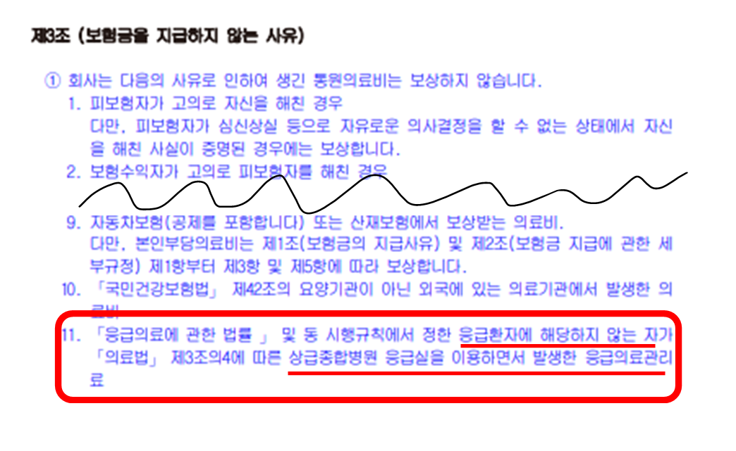 실비 약관에서 보험금을 지급하지 않는 사유를 확인하면 '응급환자에 해당하지 않는 자가 상급종합병원 응급실을 이용하면서 발생한 응급의료관리료는 지급하지 않는다'는 내용을 볼 수 있어요. 응급실 실비 청구가 불가능했거나 보상 지급액이 너무 적은 경우는 이러한 경우예요. 필자도 그랬어요. 친절한 실비 약관이에요.