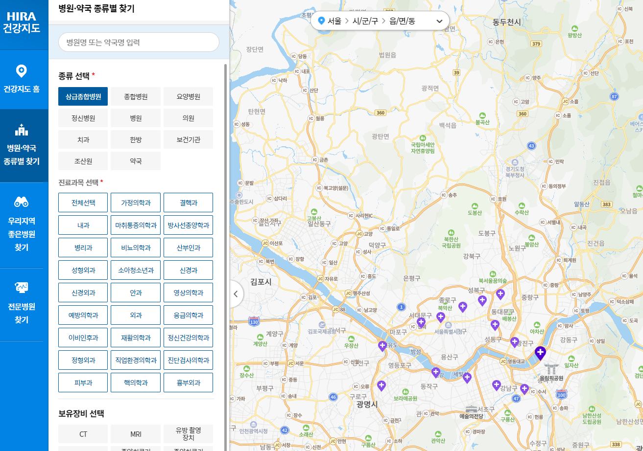 필자의 경우 건강보험심사평가원에서 병원을 찾아요. 건강보험심사 평가원 -> 의료정보 -> 병원, 약국 찾기. 로그인 없이 쉽게 찾을 수 있어요. 집 근처 가까운 곳에 응급의학과가 있는 종합병원 정도는 미리 알아두는 게 좋아요.