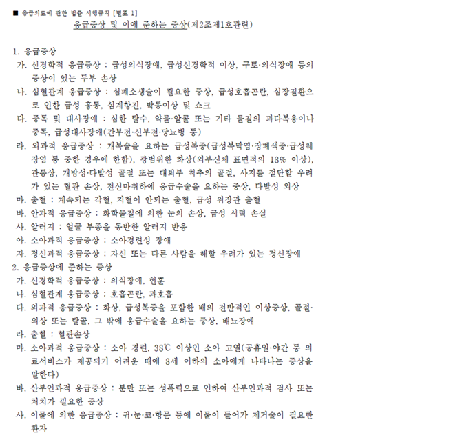 외과적 응급증상: 개복술을 요하는 급성복증(급성복막염, 장폐색증, 급성췌장염 등 중한 경우에 한함), 광범위한 화상(외부신체 표면적의 18% 이상), 관통상, 개방성, 다발성 골절 또는 대퇴부 척추의 골절, 사지를 절단할 우려가 있는 혈관 송상, 전신마취하에 응급수술을 요하는 증상, 다발성 외상.