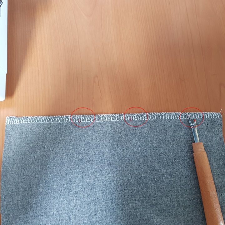 바늘실에 뜯게를 넣는다. 바늘 실은 원형으로 고리가 만들어진 부분이 아니라 직선 박음질된 부분이다.
