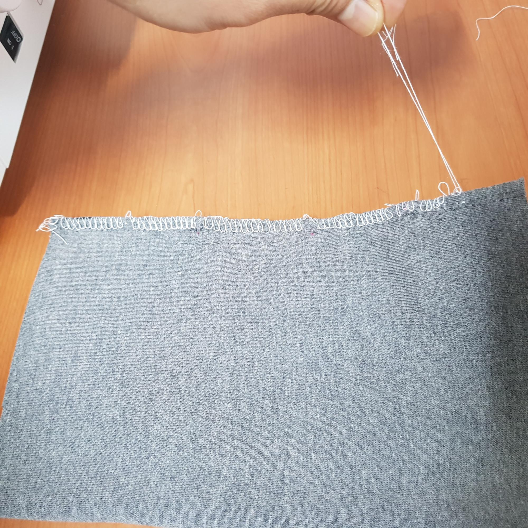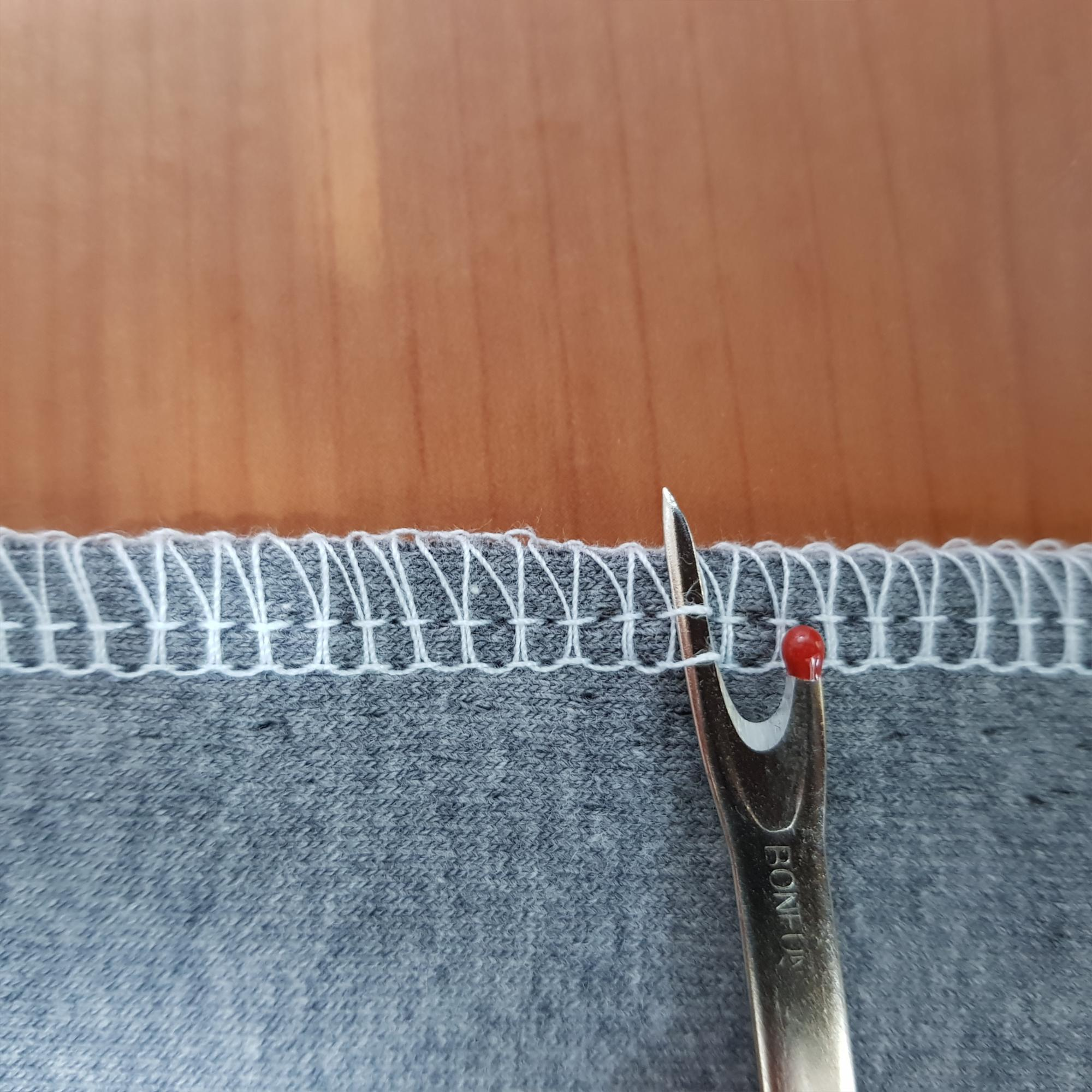 바늘실에 뜯게를 넣는다. 바늘 실은 원형으로 고리가 만들어진 부분이 아니라 직선 박음질된 부분이다.