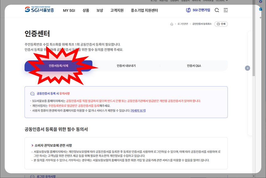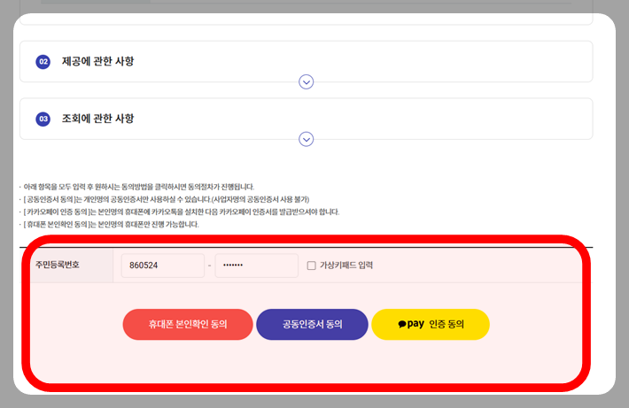 자주 쓰는 동의에서 01 계약체결·이행을 위한 동의 -> 개인용 동의하기 클릭 -> 각종 체크박스 동의함에 동의 -> 주민등록번호 입력 -> 개인인증서로 인증.