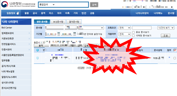 문서함에 들어가면 낙찰된 공고가 보여요. 공고명 클릭해요.