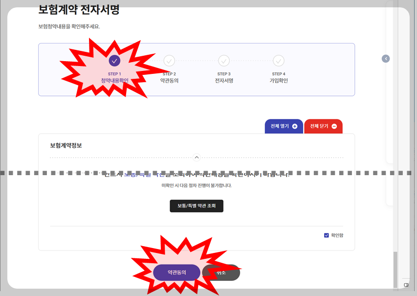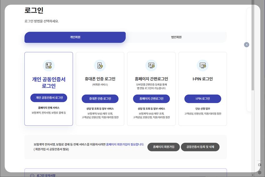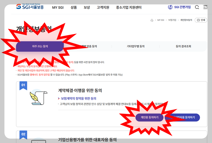 자주 쓰는 동의에서 01 계약체결·이행을 위한 동의 -> 개인용 동의하기 클릭 -> 각종 체크박스 동의함에 동의 -> 주민등록번호 입력 -> 개인인증서로 인증.