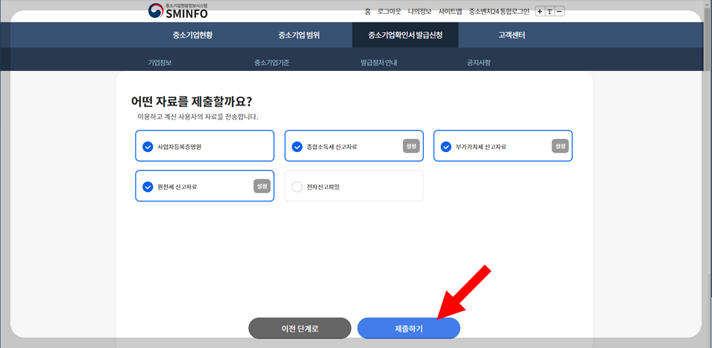 사업자등록증명원, 종합소득세 신고자료, 부가가치세 신고자료, 원천세 신고자료가 기본적으로 선택되어 있어요. 기본적으로 선택되어 있는 4가지 자료가 선택되어 있으면 제출하기를 클릭해요. 그러면 서류 제출은 끝났어요.