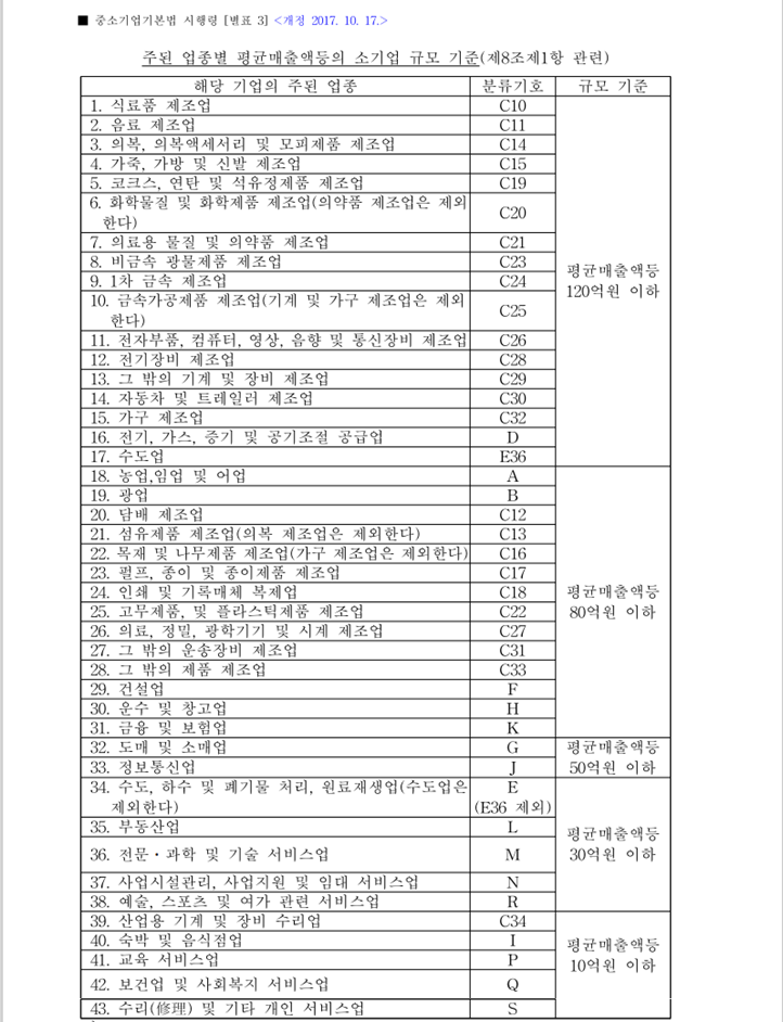 - 중소기업기본법 시행령 [별표 3] https://www.law.go.kr/LSW/lsInfoP.do?efYd=20210609&lsiSeq=232597#J13065141