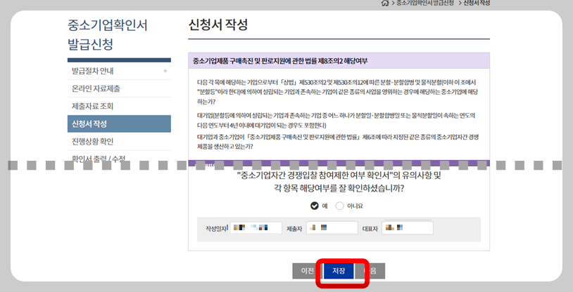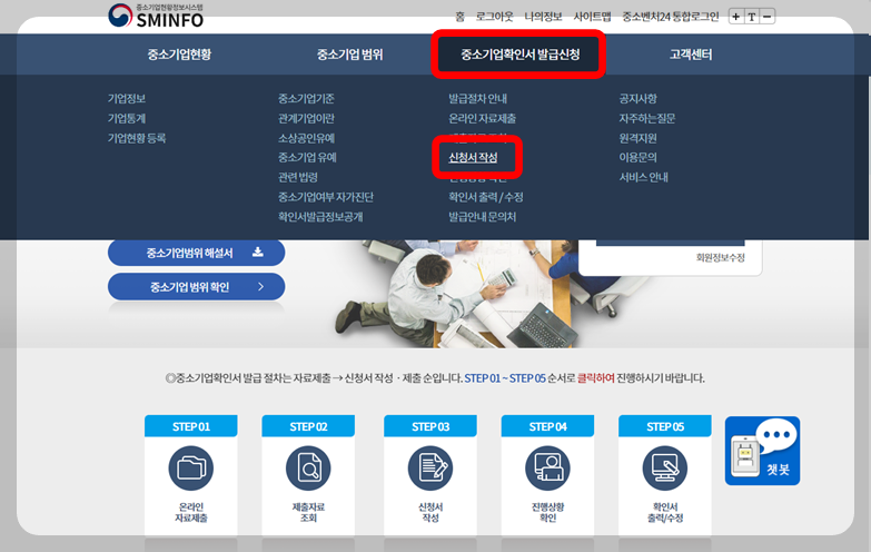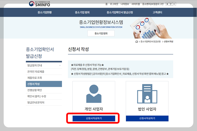 중소기업확인서 발급신청 -> 신청서 작성을 선택해요.