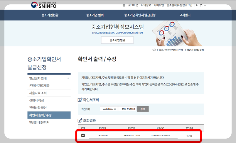 중소기업확인서발급신청 -> 확인서출력/수정 클릭