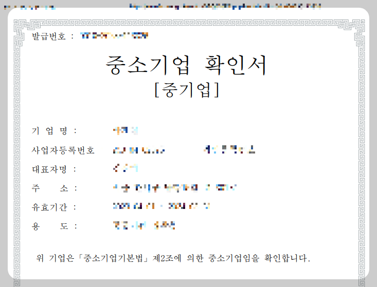 조회된 확인서가 있어요. 확인결과 중기업으로 나와요. 이상해요. 필자가 알기로 매출액이 최소 10억 이상, 상시근로자 5인 이상이어야 중기업인데...