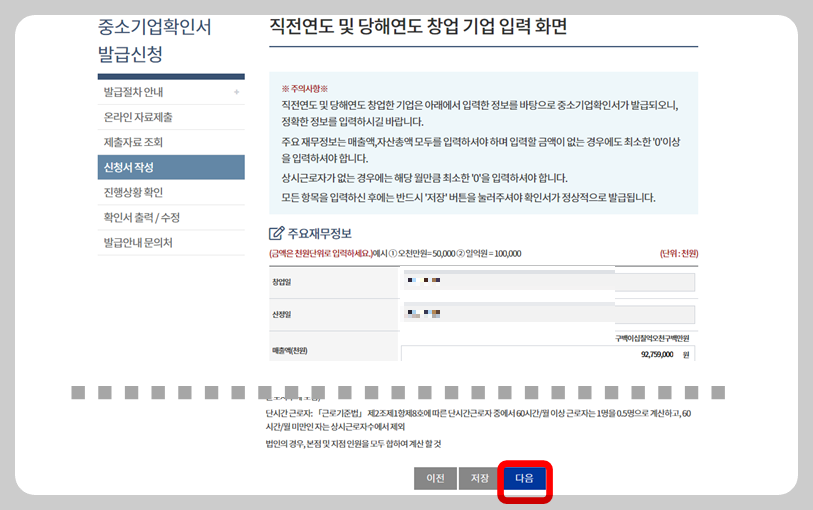 매출액, 자산총액, 상시근로자수를 입력하고 저장을 클릭해요.