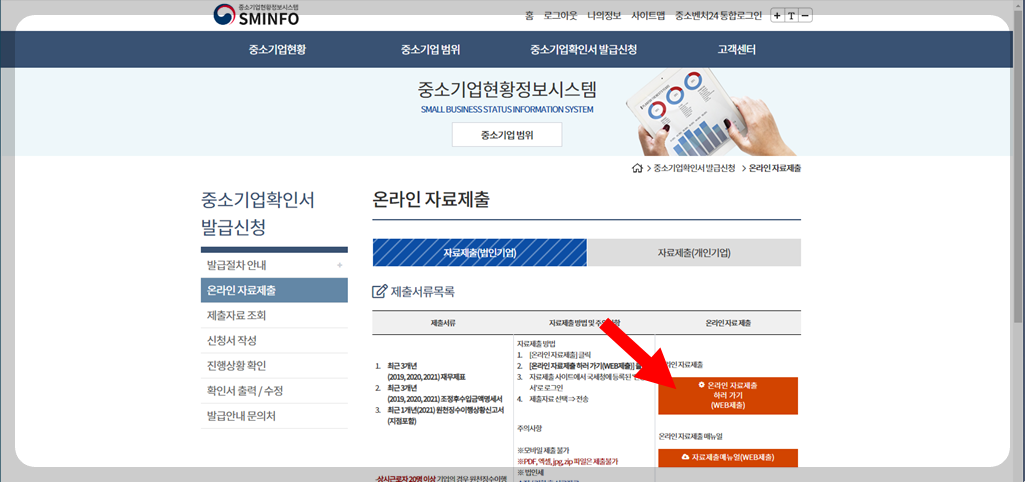 자료제출(법인기업) 또는 자료제출(개인기업) 둘 중 하나를 선택해요. 그리고 온라인 자료제출을 클릭해요.